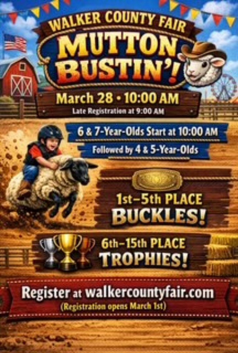 5. If you haven’t already done so, please consider signing up to help with Mutton Bustin’ on April 1st at the Walker County Fairgrounds. It’s always a great time to help the kids, the fair association and advertise for our church.